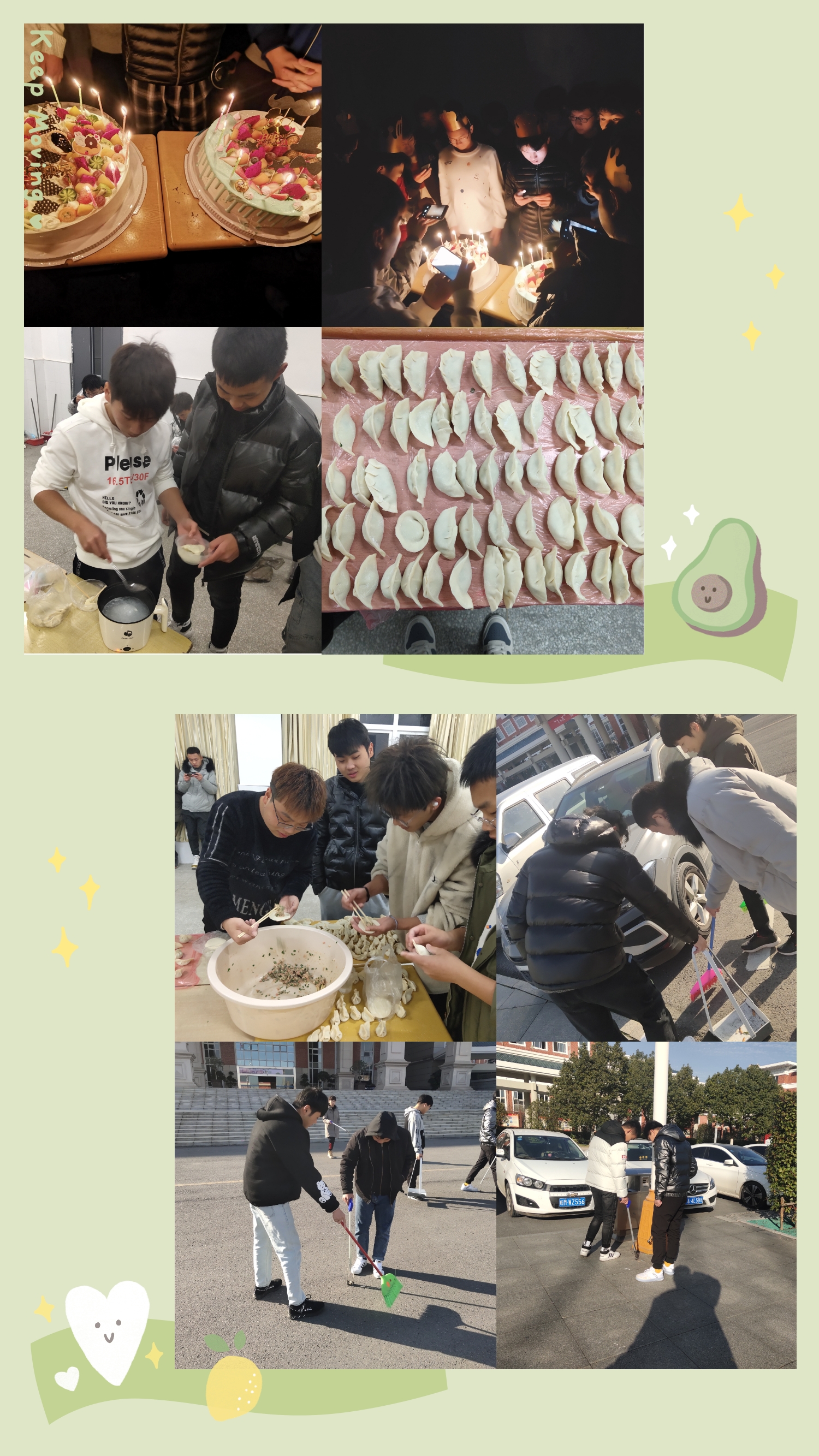 活动伊始,19级新能源汽车2班全体同学齐聚5212教室,在班长卢宇航同学的组织下,每位同学总结了本次劳动周的所获所得;其后,经过大家的一起协作下,包了许多饺子,供大家品尝,体验劳动带来的快乐;最后,大家在一起为班里冯豪、姜浩然、刘平、朱致远等四位同学过了一个特殊而难忘的生日。