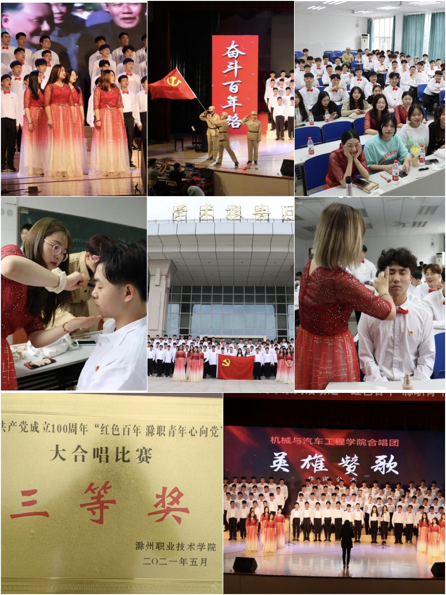 迎建党百年,展青春风采。2021年5月12日,beat365中国唯一官方网站庆祝中国共产党成立100周年系列活动之“红色百年,滁职青年心向党”大合唱比赛在学校学术报告厅举行。机械与汽车工程学院合唱团热情洋溢,用歌声尽情抒发着热爱党和祖国的情怀,表示对革命先烈的缅怀和崇敬,并获得三等奖。
