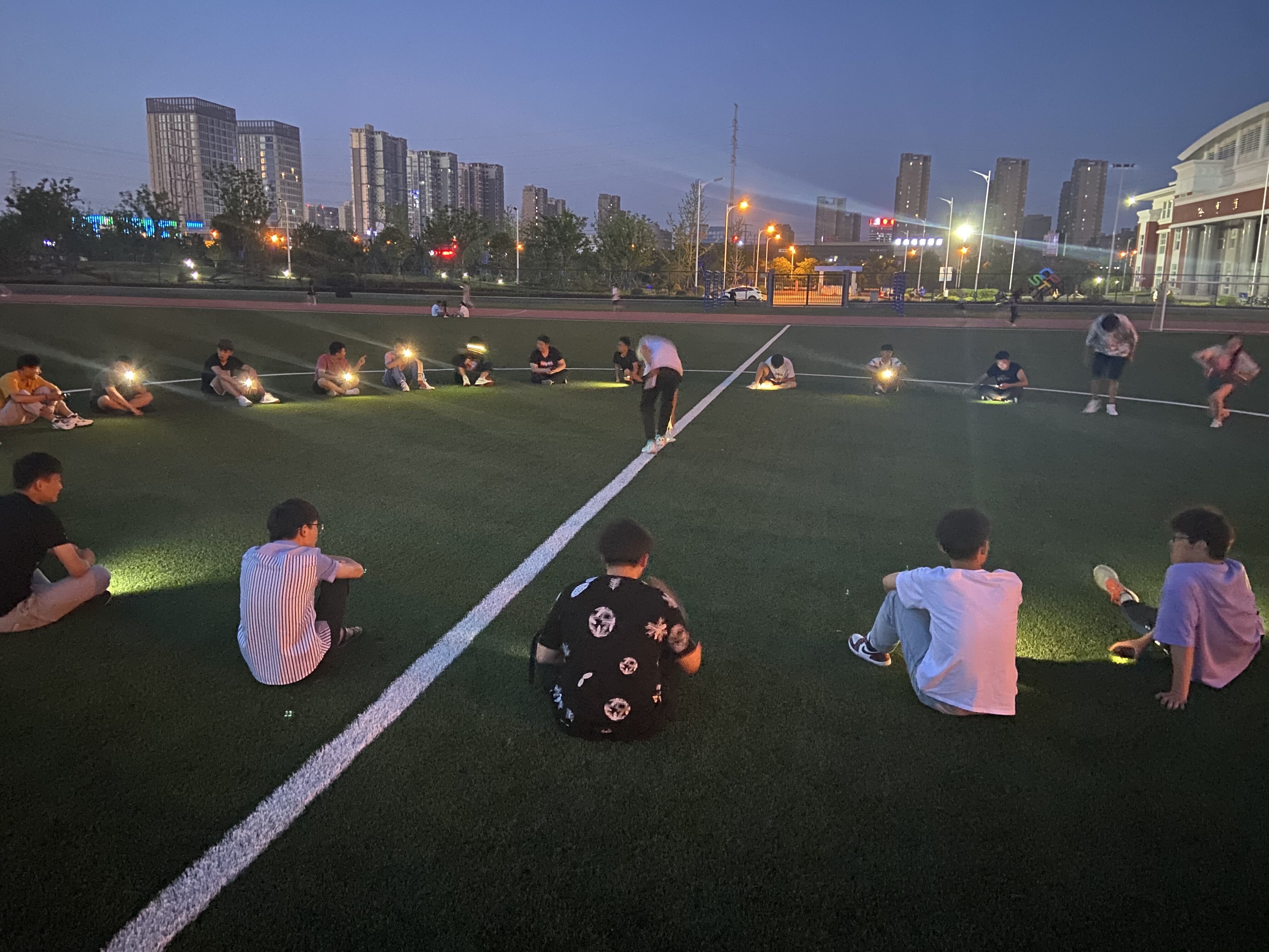 经过前期充分准备与宣传,活动现场不仅有我院团学干,更有慕名而来参观的其他学院的同学。在晚霞的陪伴下活动开始,首先由同学们手拉手围成一个大圆圈进行自我介绍,随后介绍游戏项目与规则。此次活动选择了丢手绢游戏。操场上充满了欢声笑语,大二学生干部带头参加更让现场活动气氛进一步引向高潮。