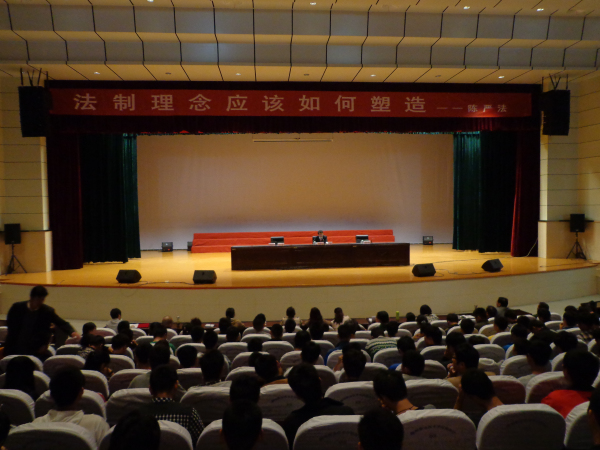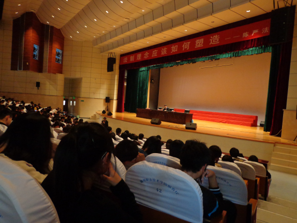 本次大会的主题是“法治理念,应该如何塑造?”会议一开始,陈院长就为同学们分析了阻碍法制问题的因素,之后又分析了建立法治思维的共识。并运用了大量的历史社会经典案例,向同学们展示了法制的重要性。随后院长李柱梁向陈院长颁发了聘书,正视聘请陈严法院长为我院的客座教授。最后院长李柱梁和副院长江洁分别对此次大会作出了重要讲话,指出了此次活动意义的所在,为建设平安学院打下了法制基础。