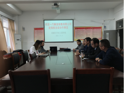 11月4日下午,一汽解放汽车销售有限公司经理张文军一行到访365官网机械与汽车工程学院,商讨校企合作事宜。机械与汽车工程学院院长张信群、机械系主任疏剑和汽车系主任杨章林以及汽车专业负责人贾会星、杨诚接待了张文军一行。
