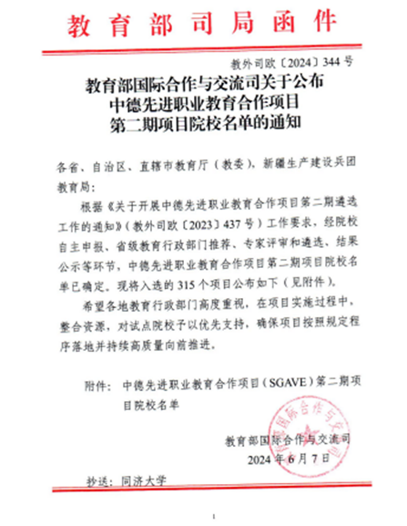 中德先进职业教育合作项目(SGAVE)由教育部与德国等欧洲职业教育先进国家行业龙头企业联合实施,根据《中华人民共和国经济和社会发展第十四个五年规划和2035年远景目标纲要》中所涉及的汽车等重点领域相关专业,在全国范围内遴选试点院校,旨在深化产教融合、校企合作,深入推进育人方式、办学模式、管理体制、保障机制改革,借鉴德国“双元制”办学模式,推动建设具有国际先进水平的中国特色职业教育体系。