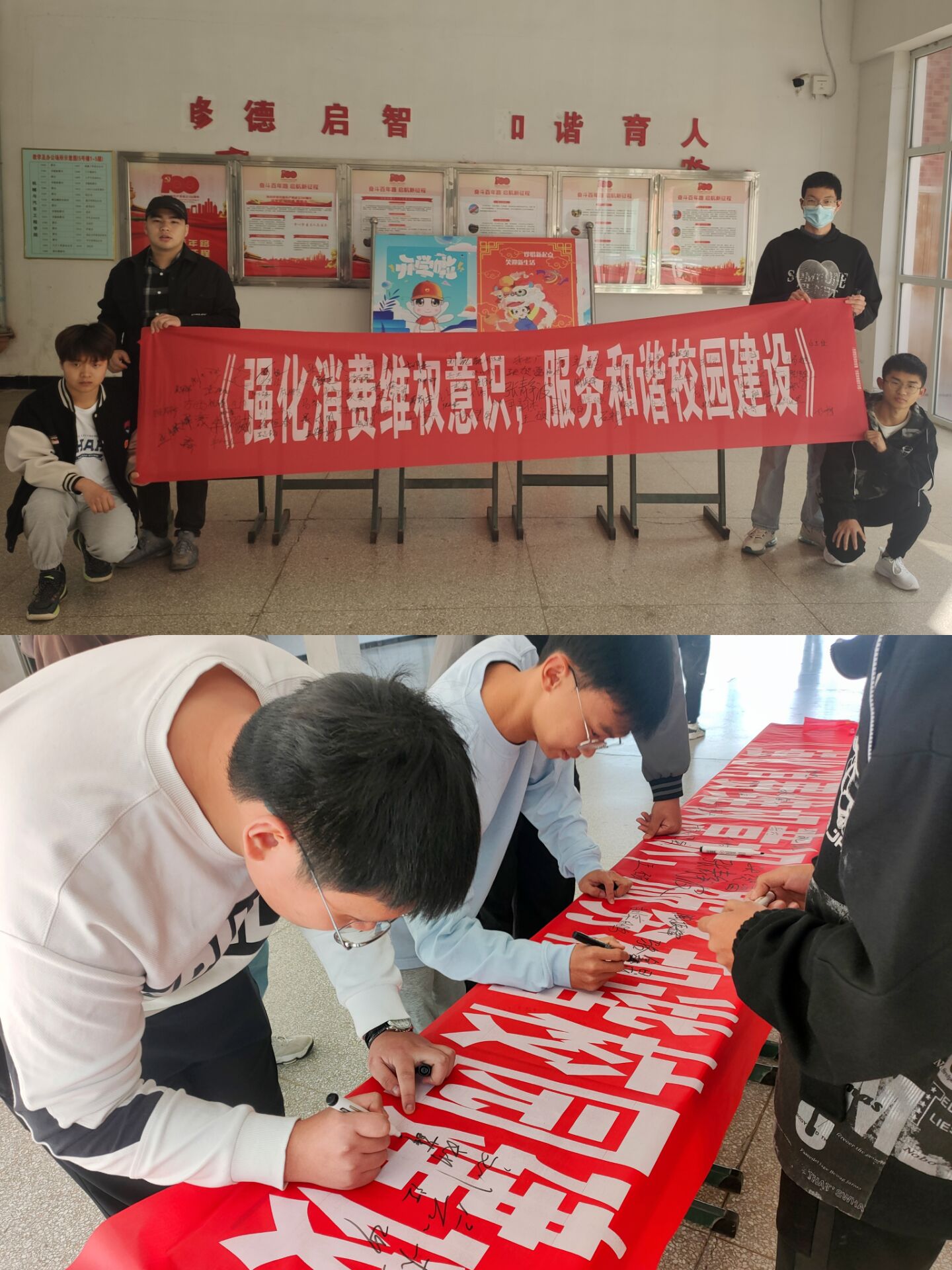 活动中,权益部人员向同学们发放了消费者权益知识宣传单,旨在帮助同学们了解消费者的权利和义务,加深同学们对权益知识的学习,并将“3·15维权日”横幅摆放在5号教学楼大厅内,同学们依次有序地在横幅上签下了自己的名字,通过自己的行动表示对活动的支持,并在活动圆满结束后合影留念。