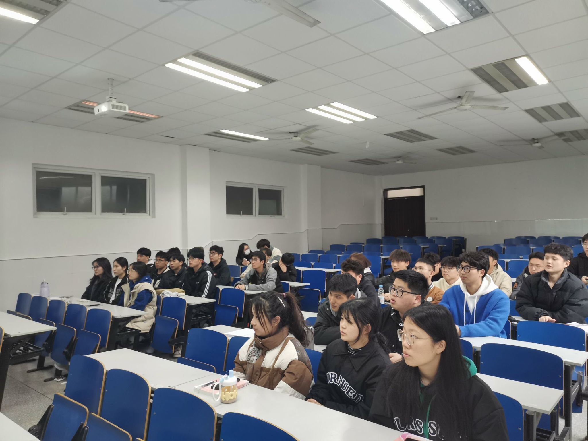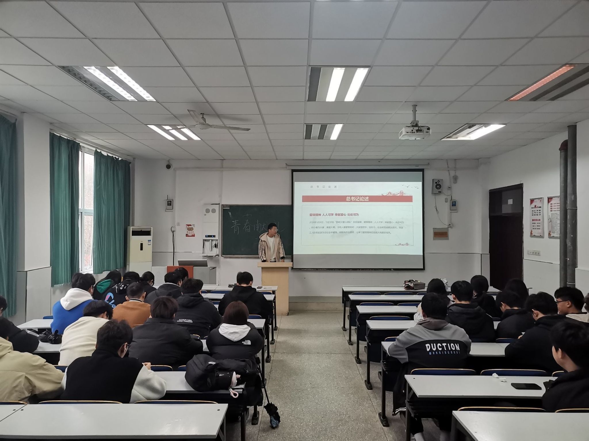 主讲人积极与大家互动,引导同学们交流自己的梦想,引出了中国梦这个主题。同学们踊跃发言,积极参与。主讲人为大家讲述了中国特色社会主义的基本制度、政策方针、指导思想。台下的同学时而认真做笔记。最后,王国顺告诉同学们一定要在努力学习科学文化知识的同时,服务社会、服务国家,争取做一名优秀的共青团员。