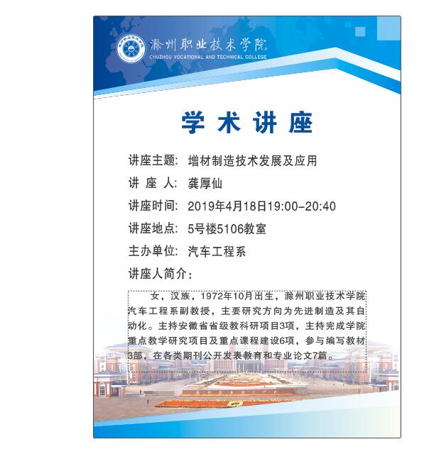 龚厚仙,女,汉族,1972年10月出生,beat365中国唯一官方网站汽车工程系副教授,主要研究方向为先进制造及其自动化。主持安徽省省级教科研项目3项,主持完成学院重点教学研究项目及重点课程建设6项,参与编写教材3部,在各类期刊公开发表教育和专业论文7篇。