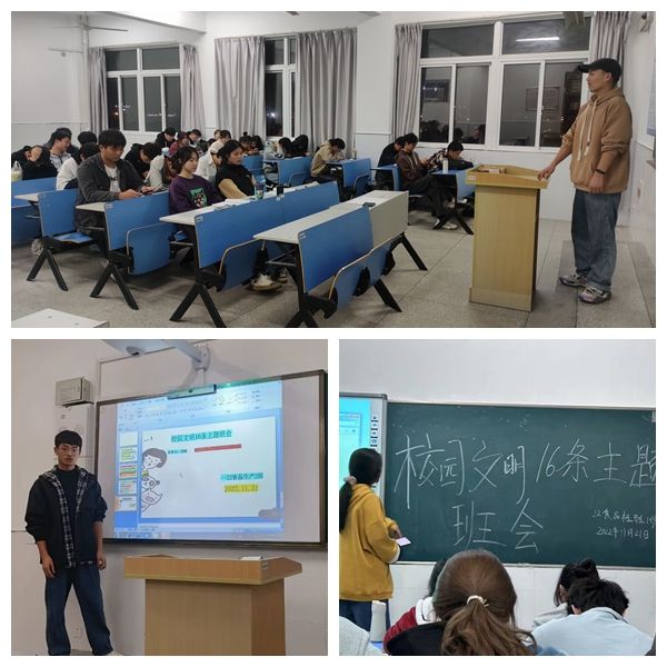 为了加强学生们对文明校园的理解,提高学生们的文明素养,食环学院各班级于11月21日-23日在致善楼开展“校园文明16条”主题班会。