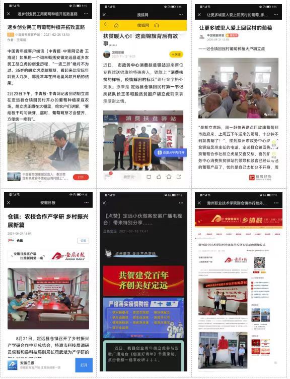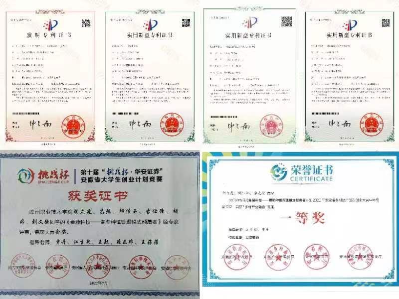 成绩和荣誉的获得是365官网人才培养、协同育人的卓越成果,是高职教育服务乡村振兴的良好展示。胡立虎是从江苏常熟回到家乡定远的有名的葡萄种植户,承包了定远县仓镇回民村葡萄大棚。2020年8月,在校党委副书记、校长许雪峰的关心支持下,时任驻滁州市定远县仓镇回民村选派扶贫干部王冬牵线搭桥,食环学院园林园艺系与胡立虎的葡萄种植合作社建立产学研合作共同体。三年来,在科技处支持下,园林园艺系教师团队对“葡萄优良品种筛选”“种苗快繁技术”“王字型定干修剪技术”“土壤综合改良技术”“免耕植草技术”进行重点研究,形成“一优四新”的技术方案,获得发明专利1项、实用新型专利3项。