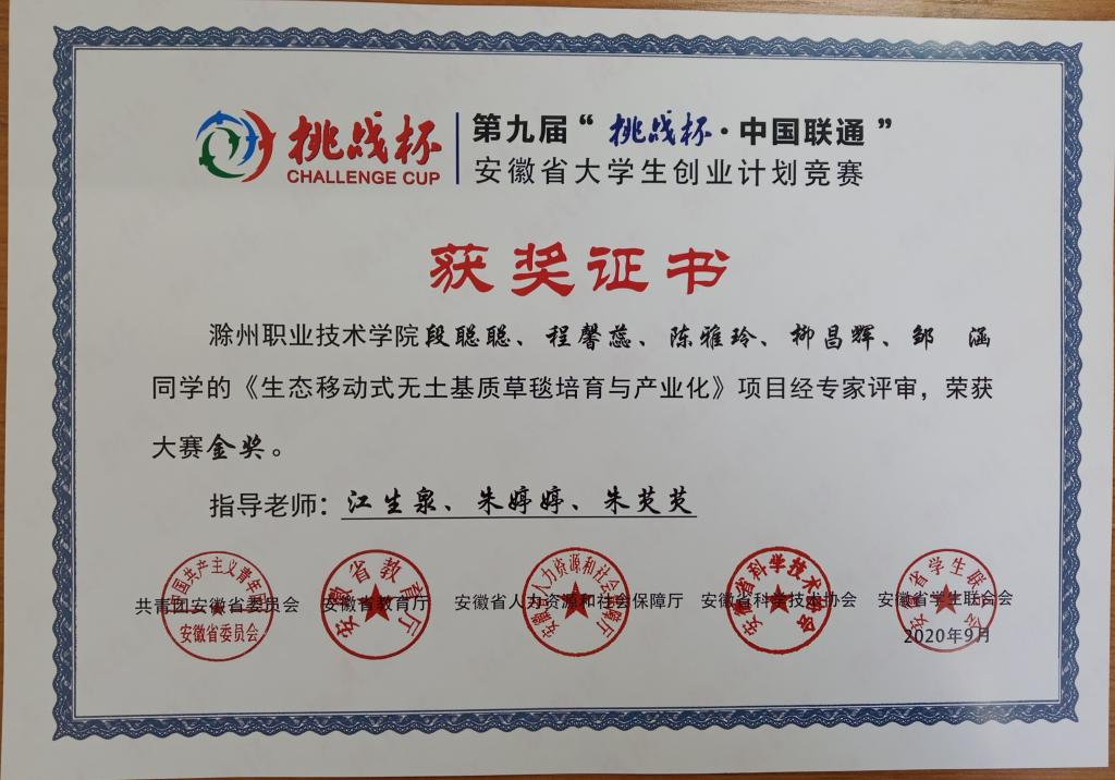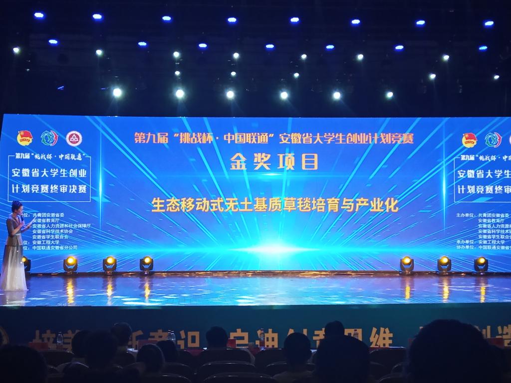 9月5日至7日,第九届“挑战杯.中国联通”安徽省大学生创业计划竞赛终审决赛在安徽工程大学隆重举行。365官网食品与环境工程学院18园林2班段聪聪、程馨蕊、陈雅玲、柳昌辉、邹涵同学的“生态移动式无土基质草毯培育及产业化项目”经过校赛、省赛初赛及终审决赛多轮紧张角逐,最终荣获大赛金奖,并顺利晋级国赛。该金奖也是生态环保和可持续发展组别中唯一获金奖的高职院校,其项目产品也受到评委专家及领导的充分肯定。