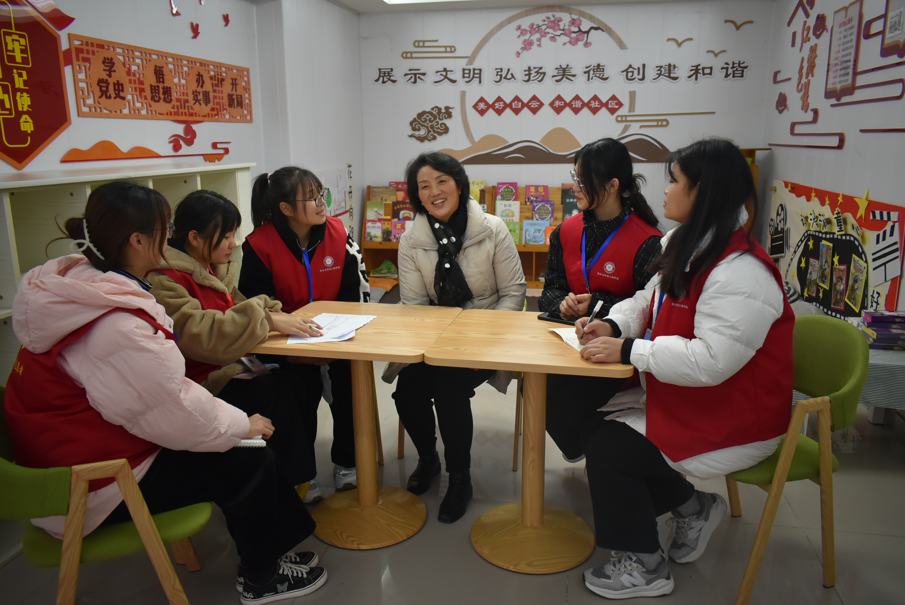 在白云社区工作人员的介绍下,同学们在社区党群活动室见到了周邦琴女生,她朴实大方,因关爱邻里、孝敬公婆、诚实守信,被评为2014年10月“滁州好人”,她的家庭在2019年被评为“滁州市文明家庭”。同学们在访谈中了解到,周邦琴常年照顾患有尿毒症的公公和年迈的婆婆,在这过程中她虽感觉到劳累和心烦,但她并无怨言,想到了公公婆婆的好,想到了要对自己的家庭负起责任,要对得起自己的良心。她用关爱邻里,孝敬公婆,诚实守信,赢得了邻里的认可、社会的称赞。