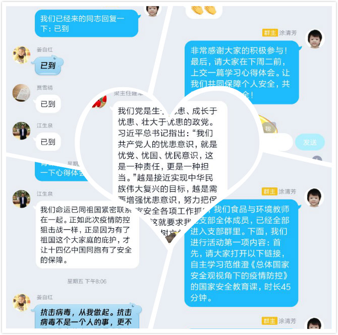 4月15日是第5个全民国家安全教育日。食品与环境教师党支部于4月17日晚7:00-8:30在支部QQ群,以“坚持总体国家安全观,统筹传统安全和非传统安全,为决胜全面建成小康社会提供坚强保障”为主题,在线开展宣传教育活动。