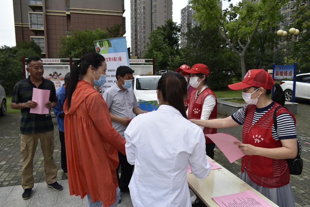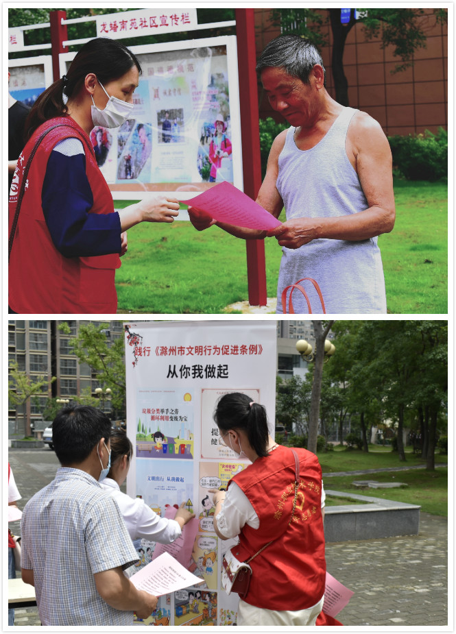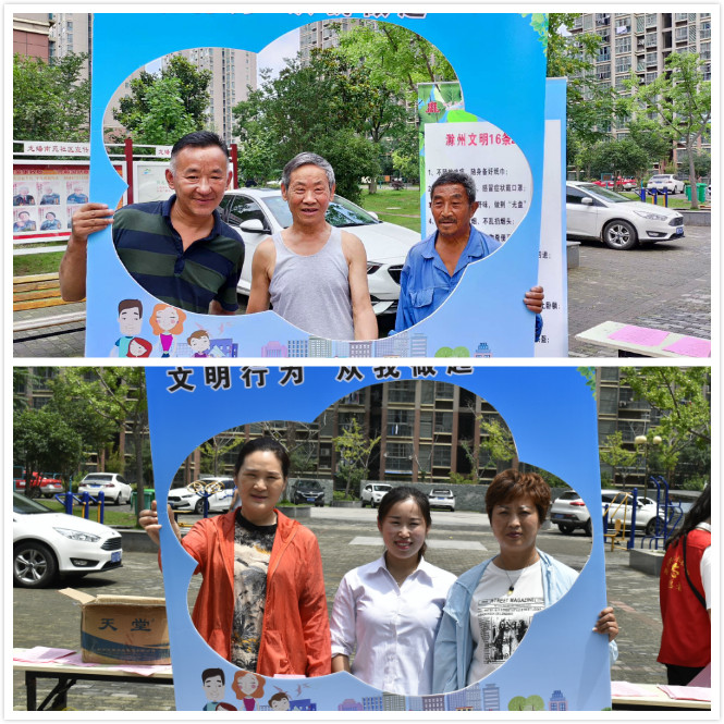 6月24上午,食环学院党员志愿者在学生管理党支部书记李瑞瑞的带领下,来到龙蟠南苑社区开展创建科普宣传。大家身穿红色志愿服、头戴志愿帽,向小区居民发放《滁州文明16条》《滁州市民公约》宣传单页,引导居民观看《滁州市文明行为促进条例》、文明创城宣传展板等,倡议广大居民从生活中的桩桩小事做起,做文明市民、建文明小区,为文明城市创建贡献力量。志愿者们的倡议得到了现场居民的积极回应,他们纷纷表示:“文明创建受益的是市民,要从身边事做起,从不乱扔垃圾、邻里互帮互助做起!”