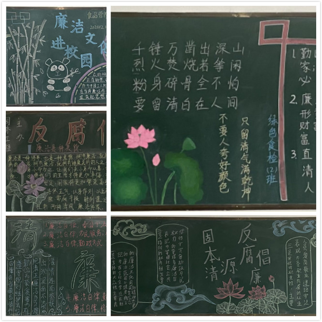 为推进我院廉洁文化建设,提高廉政文化在校园的影响力,营造廉洁从教的育人环境,我院各班级于12月10-17日出制了一期以“廉洁”为主题的黑板报。