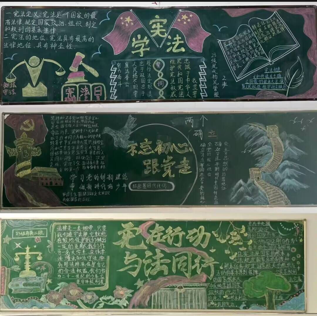 本次黑板报评比活动要求设计切合主题,内容突出教大家学法,懂法,用法。对此,各班级同学认真对待,精心设计,让每位同学以了解宪法为目标,精心设计每一块美观大方、图文并茂的黑板报,最后呈交的作品不仅绘画色彩鲜艳、版面设计新颖,且主题突出鲜明,展现了我院学子积极向上的精神面貌。经过评审,活动最终评出一等奖:23商务英语二班;二等奖:23市场营销二班、23物流管理二班;三等奖:23商英一班、23电子商务一班、23电子商务三班。