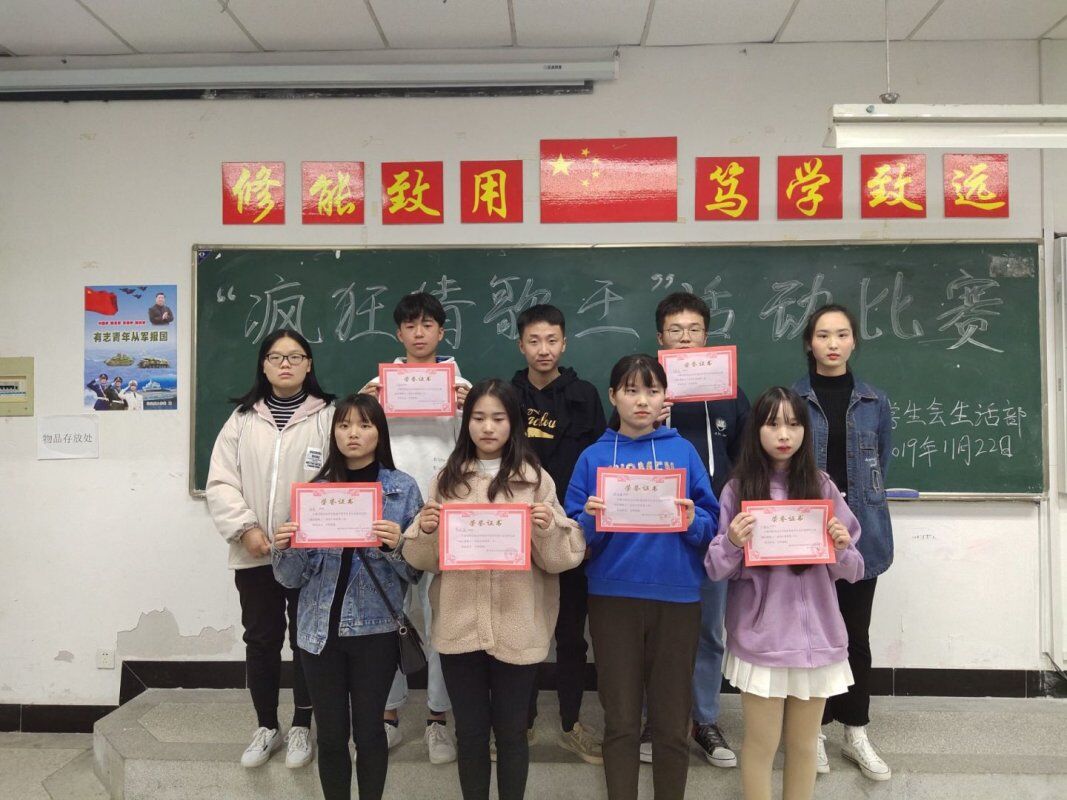 本次活动分为三部分分别是接歌词,听背景音乐猜歌名,读歌词猜歌名,活动开始时同学们踊跃举手,同学们热情似火,大家都表现出了过人的记忆力还有迅速的反应能力,场上甚至可以闻到浓浓的火药味,最终电商三班的李汉妮同学一马当先,拿下一等奖,二等奖是电商三班的于威威和商务英语的顾雨蝶,三等奖的是电商三班的王雅丽和电商二班的杨蓉,她们通过努力拿到了属于自己荣誉,活动的最后,由评委为获奖选手颁发证书并和同学们合影留念