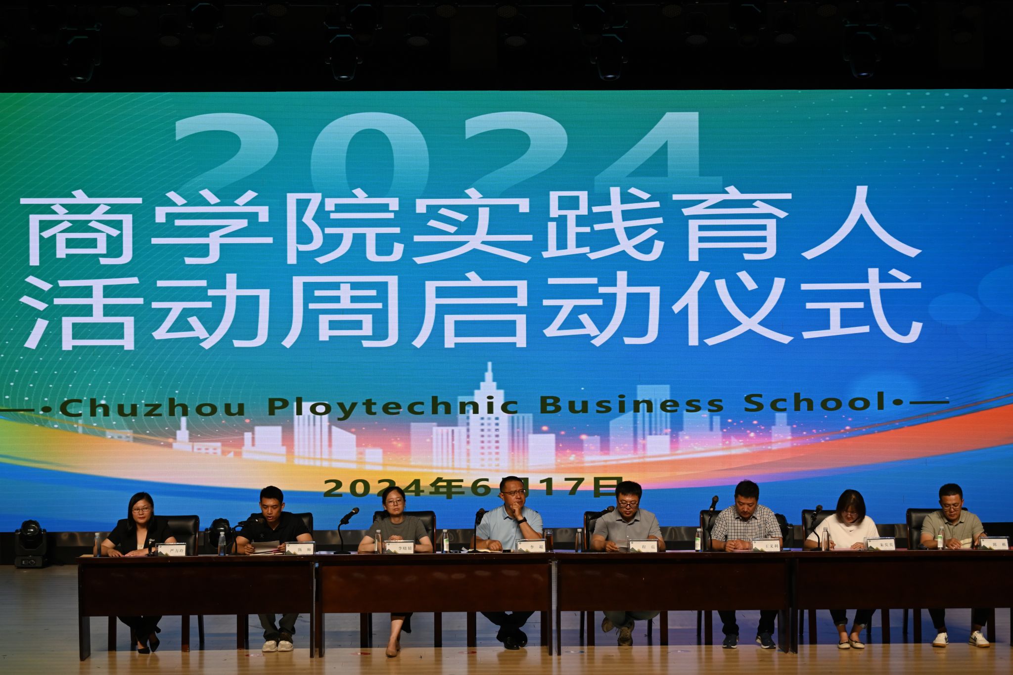 为全面贯彻习近平新时代中国特色社会主义思想,全面贯彻落实党的二十大精神,深入贯彻落实学校双高建设工作要求,以“融育商院 融创践行”实践育人新范式,贯彻落实“德技并修、工学结合”育人工作要求,教育引导商院学子积极参与实践活动,在实践中成长成才,努力成为中国式现代化建设的先锋力量,商学院组织开展2024年实践育人活动周,并于6月17日上午9时在校大礼堂召开实践育人活动周启动仪式。校党委委员、商学院党总支书记李超,院长程震,党总支副书记李晓辕、校团委书记甄帅、校招生就业处副处长王义利、商学院团总支书记朱芡芡、滁州电子商务商会秘书长陈栋、安徽天康智慧农业有限公司市场部经理、滁州市电子商务商会副会长严方玲等企业代表及商学院全体师生出席启动仪式。