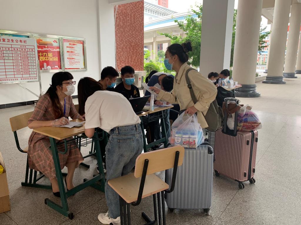 由于疫情的影响,在经历了漫长的寒假后,5月14日,商学院迎来了大二返校学生。当日上午18级各班辅导员在致真楼大厅设置接待点,迎接返校学生。学生到达学校后,需要携带返校承诺书、学生个人旅程轨迹信息和新冠肺炎疫情防控学生档案三项文件,由辅导员审核通过后,开具报到单并测量体温、领取口罩,有序进入宿舍。各班级辅导员对返校前的学生都完成了健康状况摸底,包括返校方式、出发及到达时间等信息,精细化记录各类事项,确保学生信息全程可追踪。截至当天晚上十一时,377名大二学生安全顺利返校。