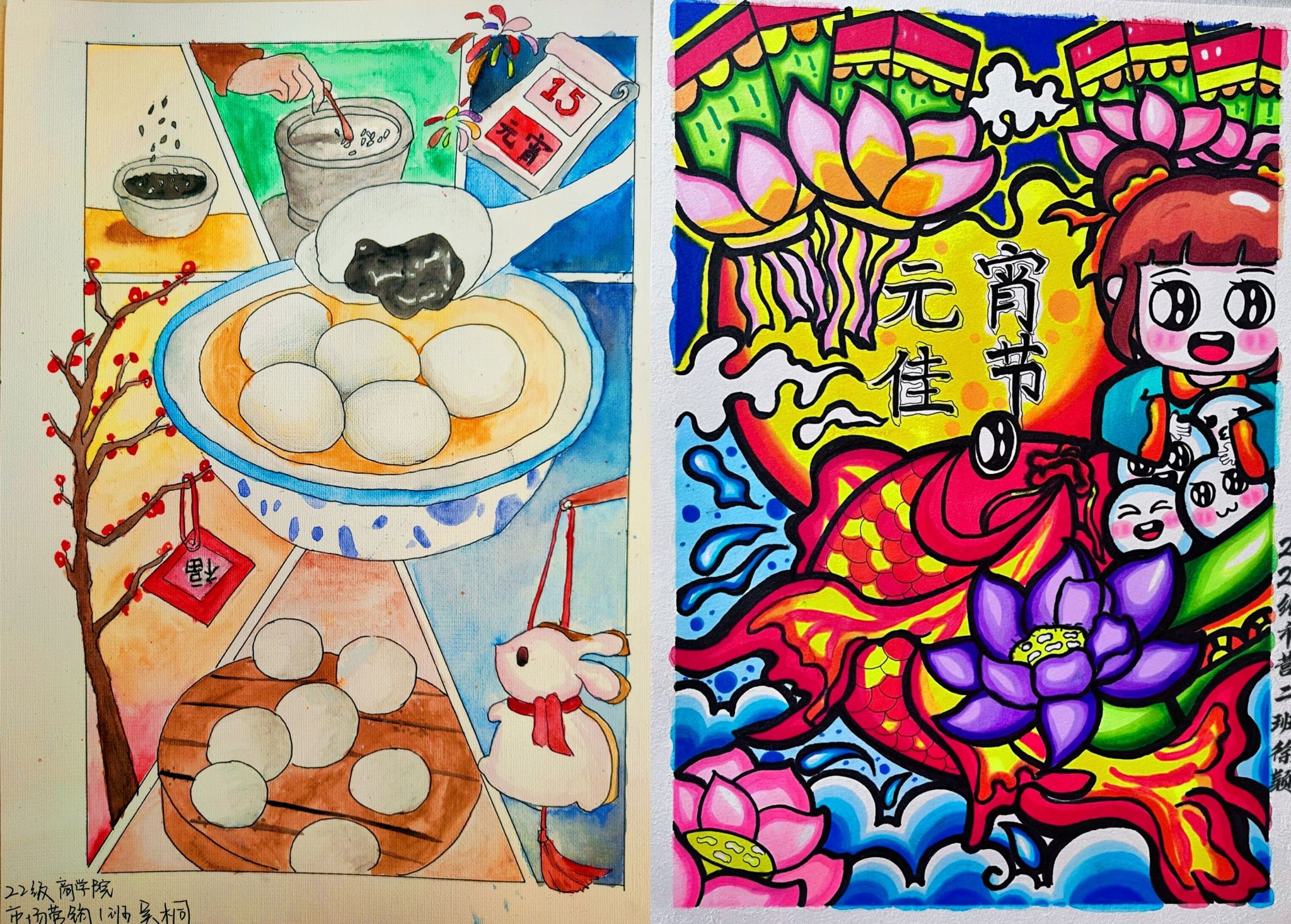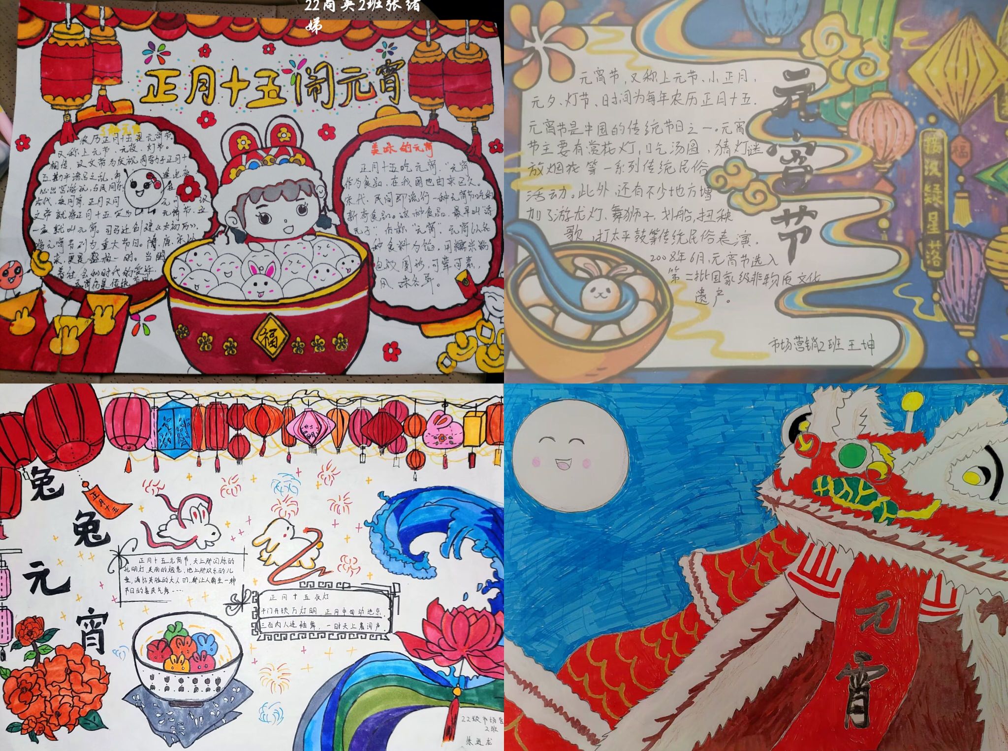 正值假期,同学们身处不同地区,根据不同的习俗和节日风貌,对作品进行了精心设计,内容丰富,形式多样,活动共收到18份作品,其中,徐颖的手绘画以哪吒为主体,以传统的元宵灯会和神话人物为创作灵感,加入了“莲花灯”,使得整体作品鲜活有趣。朱进龙和吴桐的作品都添加了“兔”和“汤圆”作为核心元素,紧紧扣住癸卯兔年元宵节的主题。此外还收到许多色彩丰富、图文并茂的作品,都展现了同学们对元宵佳节的喜悦和祝福。
