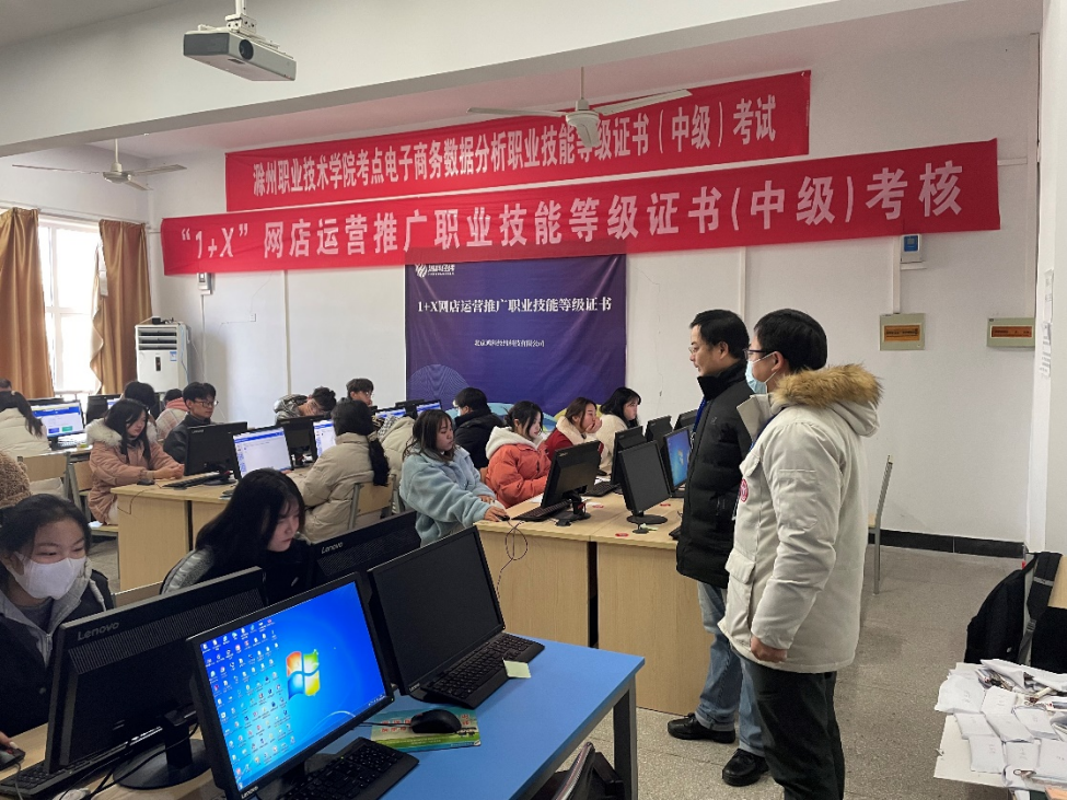 为贯彻落实《国家职业教育改革实施方案》中“1+X”证书制度试点工作的要求,加快推进365官网课证融通教学改革实践。根据教育部“1+X”证书试点工作安排,2021年12月31日,商学院在致真楼1226、1228机房举行了“1+X”网店运营推广职业技能等级证书(中级)考试,商学院电子商务专业共79名学生参加本次认证考试。