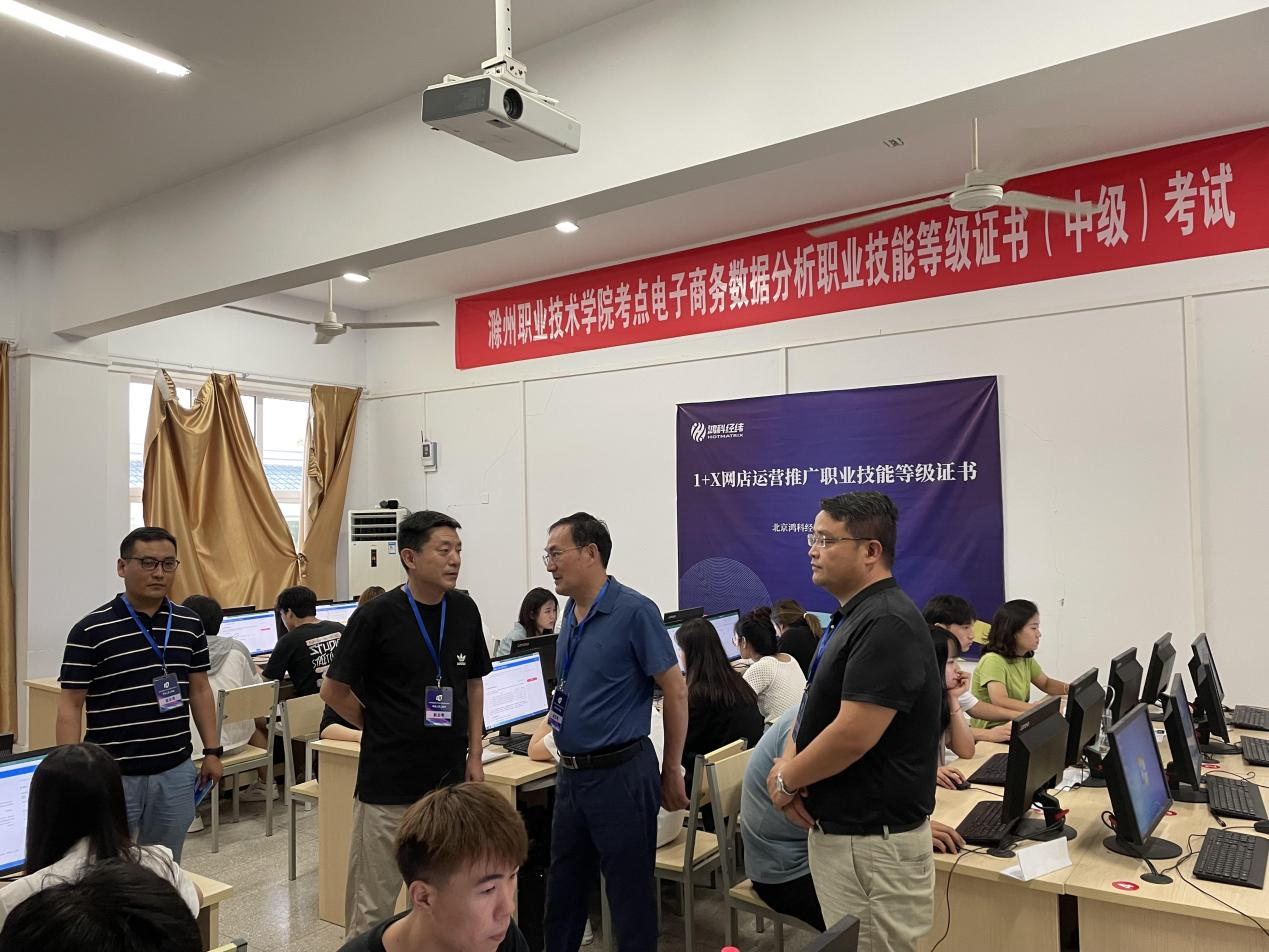 为贯彻落实《国家职业教育改革实施方案》中“1+X”证书制度试点工作的要求,加快推进365官网课证融通教学改革实践。根据教育部“1+X”证书试点工作有关要求,2021年6月26日,商学院在致真楼1226、1228机房举行了“1+X”电子商务数据分析职业技能等级证书(中级)考试。滁州城市职业学院管理学院书记陈兴旺,校实训中心主任曹晓斌、副主任刘杰,商学院党总支书记、院长李有志到现场指导工作。商学院电子商务专业共79名学生参加本次认证考试。