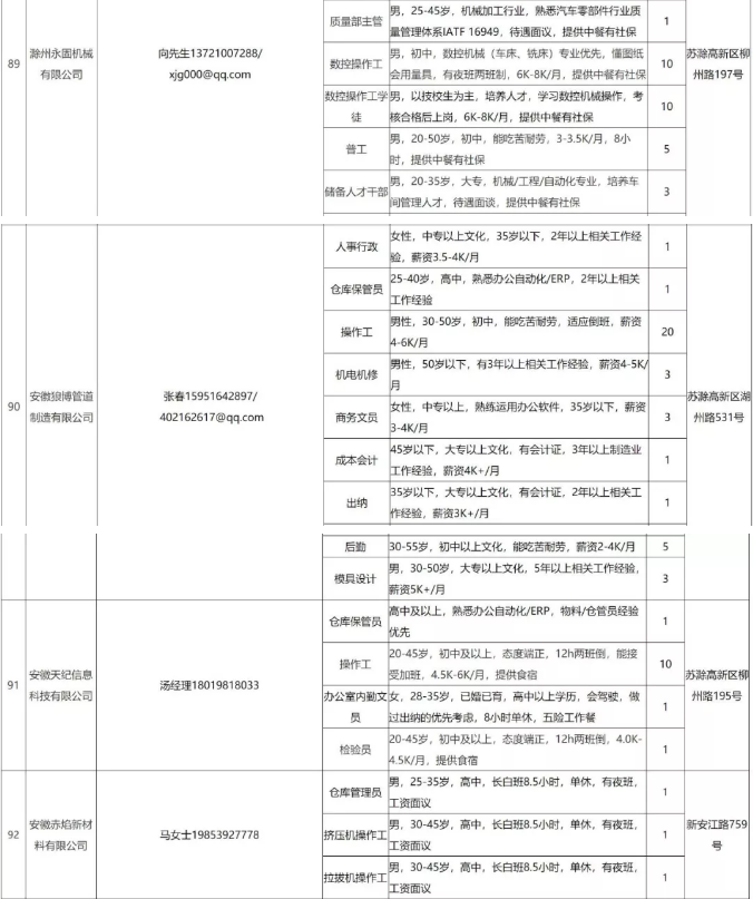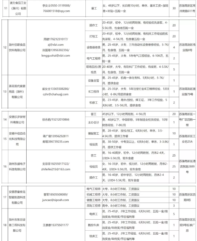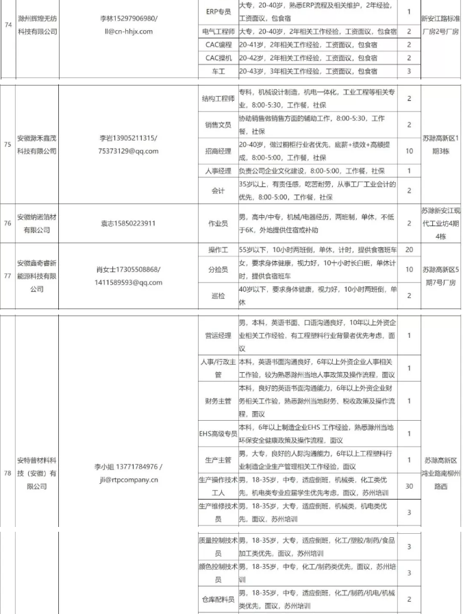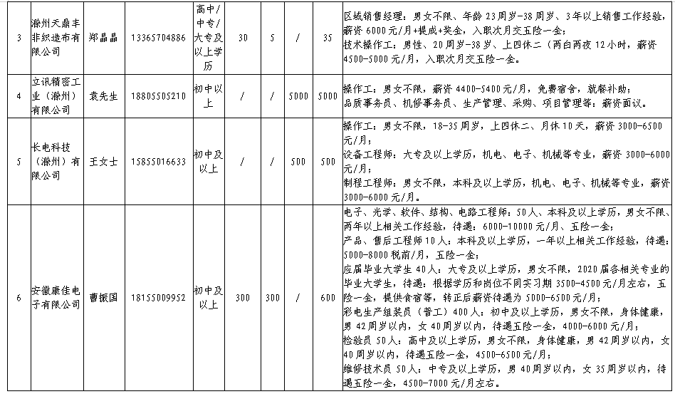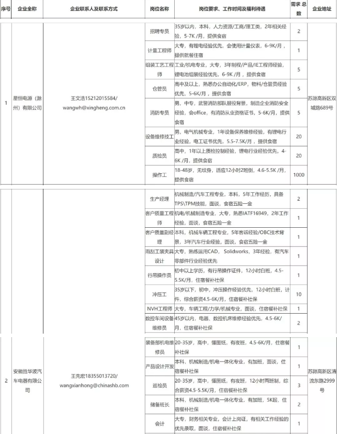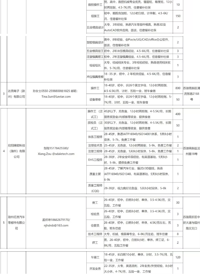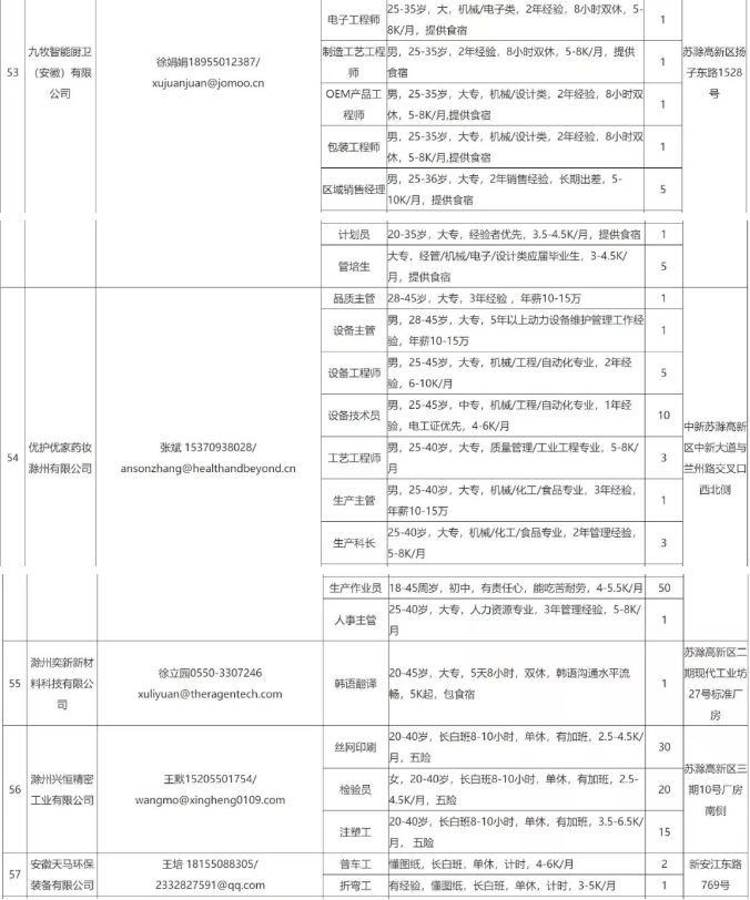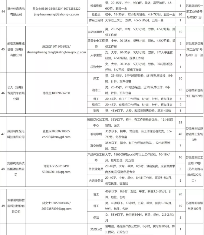 中新苏滁高新区 2020年一季度百家企业五千岗位招聘需求表