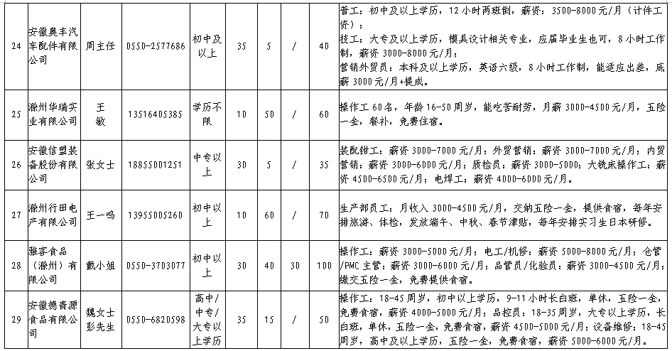 国家级滁州经开区企业2020年第一季度用工信息一览表