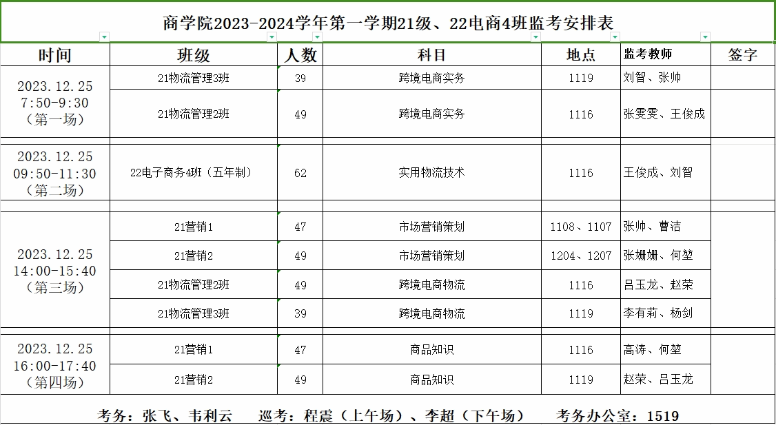 商学院2023-2024学年第一学期21级、22电商4班监考安排表