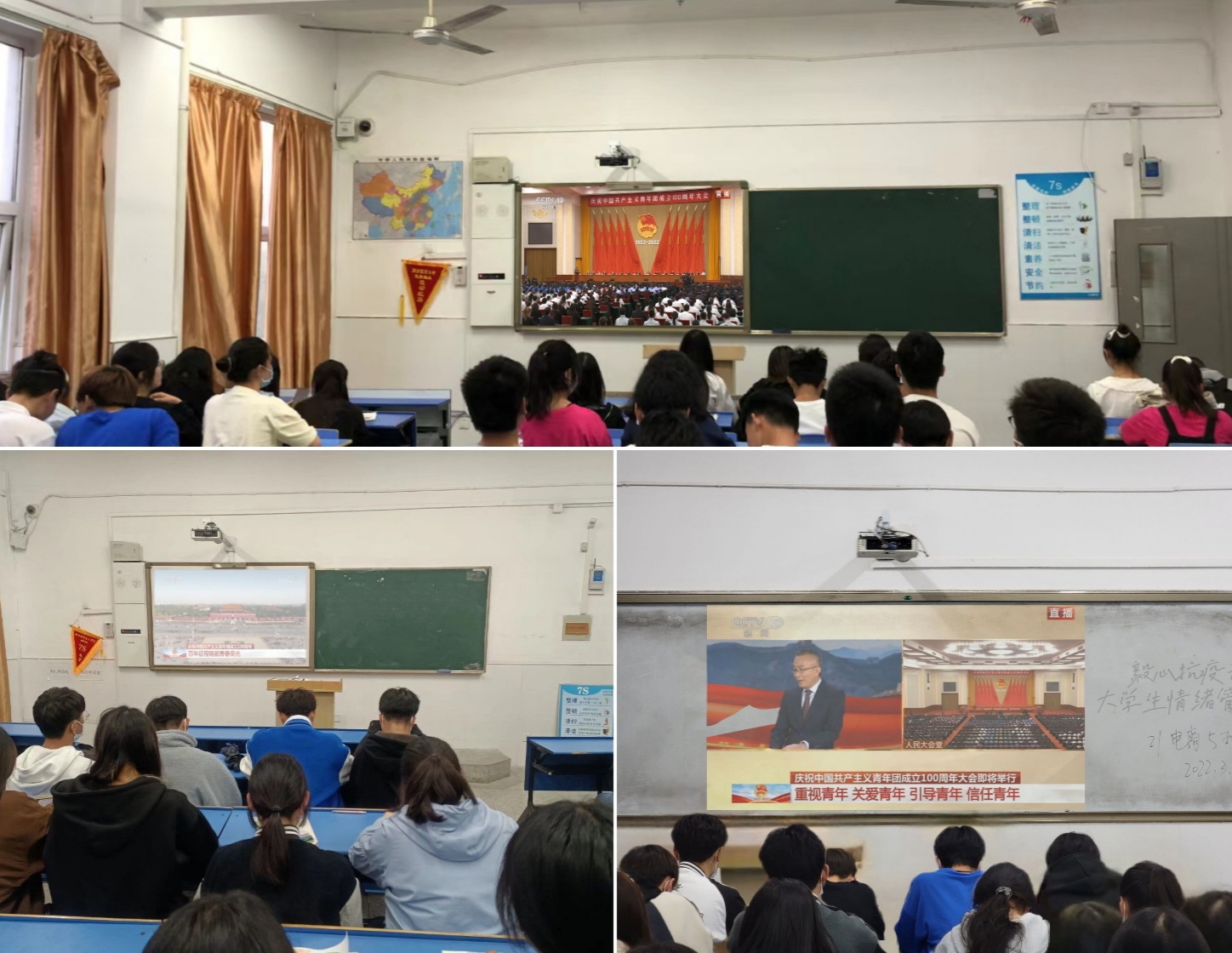 在党的二十大召开之年,中国共青团也迎来了成立百年的历史性时刻。回望百年路,青春心向党。百年砥砺前行,共青团始终团结带领广大团员青年前赴后继、坚定不移跟党走,书写了中国青年运动的华章。为进一步激励和引领广大青年团员时刻牢记习近平总书记嘱托,继承和发扬五四精神,5月10日,商学院团总支组织各个班级青年团员收看庆祝中国共产主义青年团成立100周年大会直播。