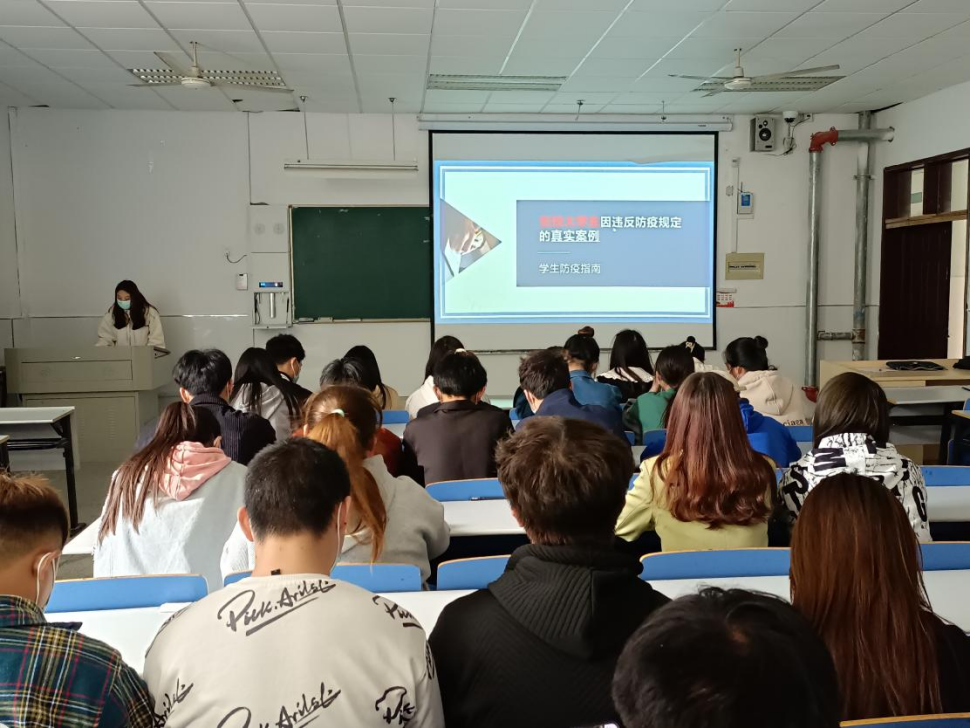活动二:开展“树牢防疫意识,保卫平安校园”疫情防控科普讲座宣传活动。向同学宣传学校最新的疫情防控政策,引导学生提高防疫意识,让同学们理解和支持学校的防控措施,积极配合学校疫情防控工作,做好自我防护,用正确的方式反映困难和诉求,共同守护好学校的疫情防线,避免出现违反疫情防控政策的违纪情况。讲座的开展让同学们更加深刻地意识到疫情防控工作的艰巨性和重要性。