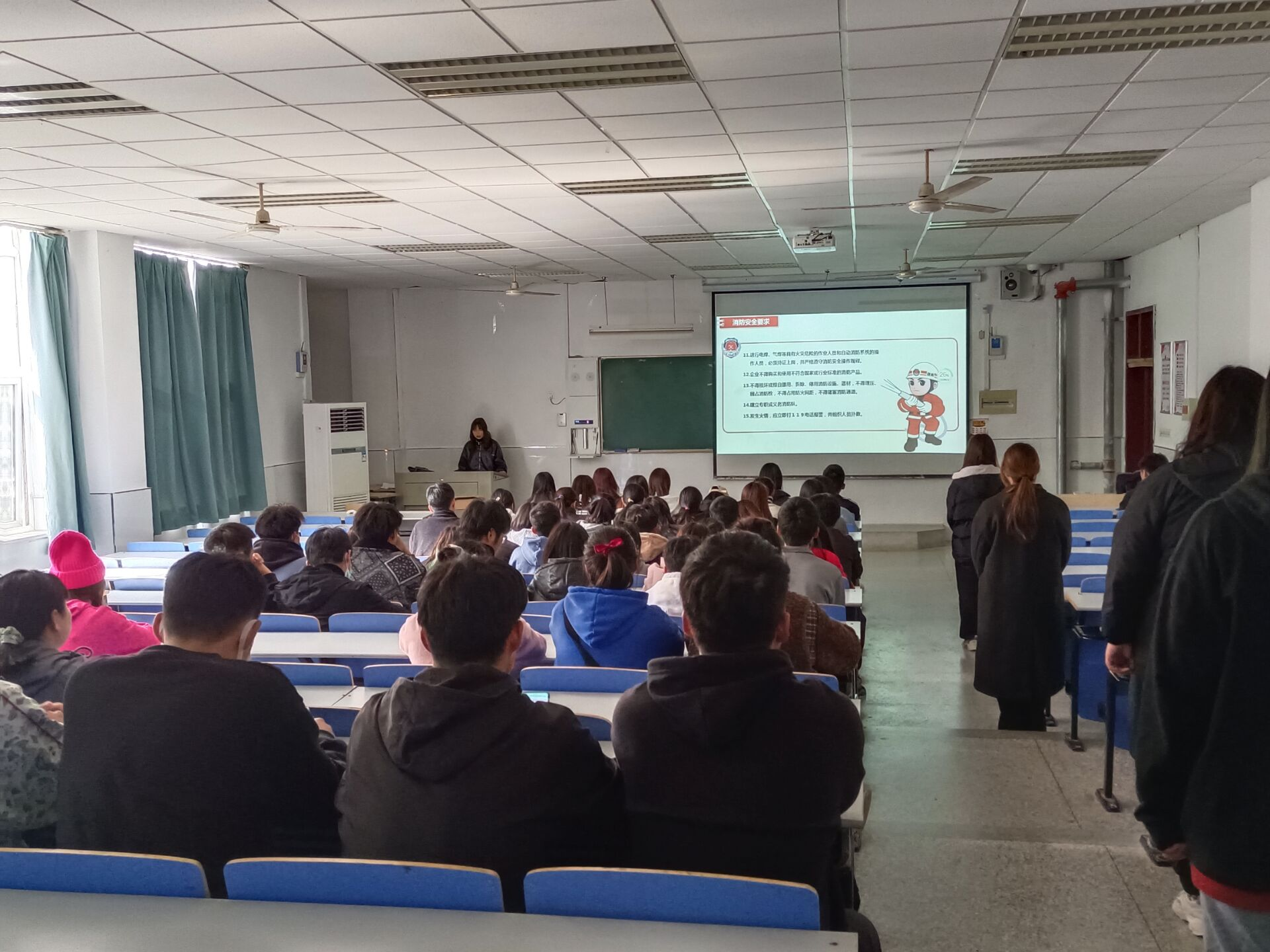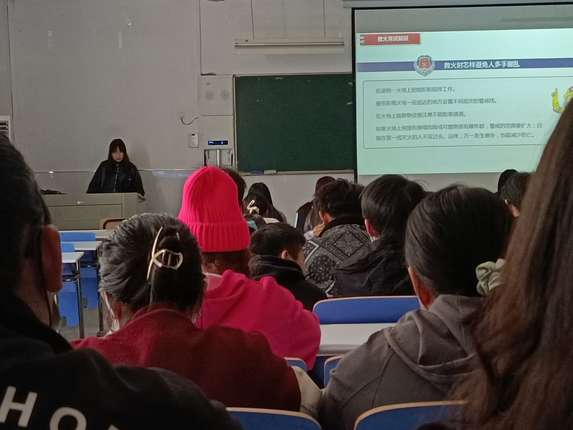 会上,团总支办公室部长姜雪芳介绍了如何正确救火与灭火,防范火灾,正确逃离火场,加强消防意识与落实相关责任等内容。消防工作跟学生生活密切相关,担起消防责任,减少安全风险,是每位同学都要切实落实的。做好消防工作,预防和减少校园火灾事故的发生,对校园及社会都具有积极影响。