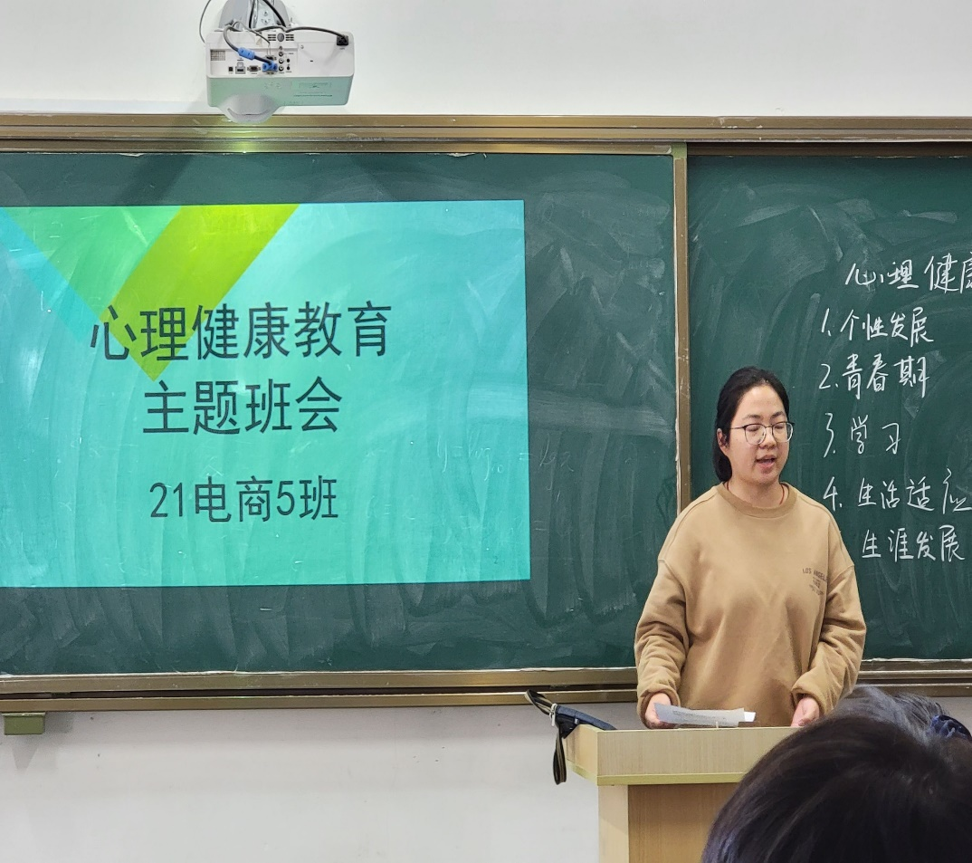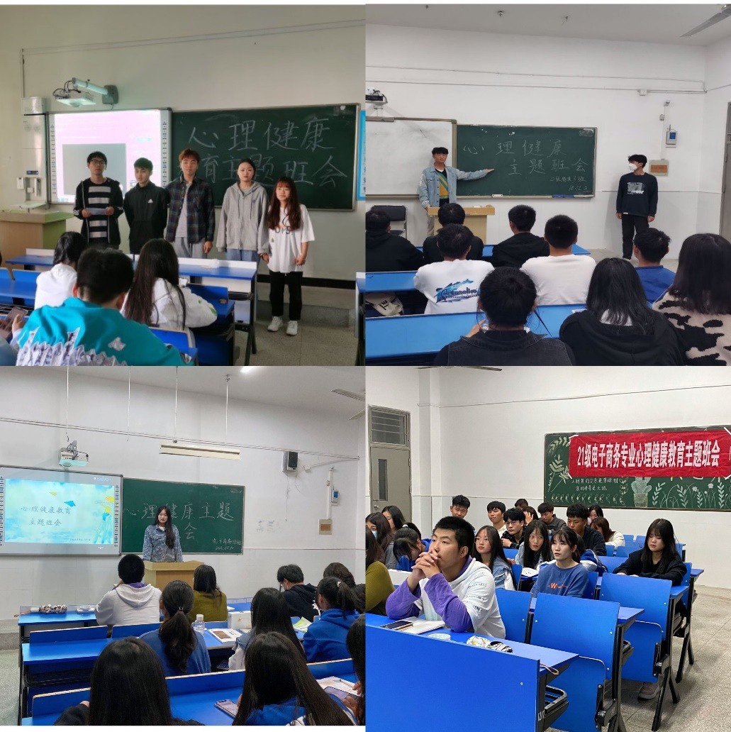 20级商务英语3班以心理健康自测图表为班会主线,通过图表测评、分析、交流讨论的形式,让班级同学对大学生心理健康“灰色区”、大学生心理健康标准以及常见心理问题类型有了更为直观地了解。21级市场营销2班以大学生典型心理问题视频切入,班会内容着重针对视频中涵盖的偏激、抑郁、孤僻等常见心理问题提出多种解决方案。21级电子商务5班从学生个性发展、青春期心理健康、学习效能与动机、生活适应与调试以及职业生涯规划等五个方面展开,真正让心理教育工作走进了班级,用易于学生理解的语言帮助他们正视心理问题,积极寻求解决方法。