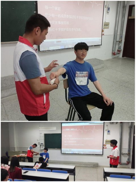 在活动期间,陈茂俊为同学们详细讲解并分析关于应急急救的相关措施及案例,同时在红十字会志愿者的专业协助下进行现场演示,通过现场演示让同学们进一步了解相关以及更好的学习相关急救知识,并让同学们进行现场操作学习。