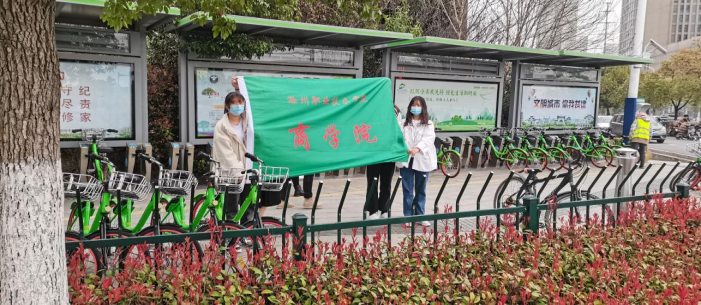共享单车的出现大大方便了人们的日常出行,但是乱停乱放的现象增加了街道的日常管理难度。针对这种情况,商学院20级物流管理(2)班的同学在2021年3月27号开展了以“以文明共享,绿色出行”为主题的整理共享单车活动。