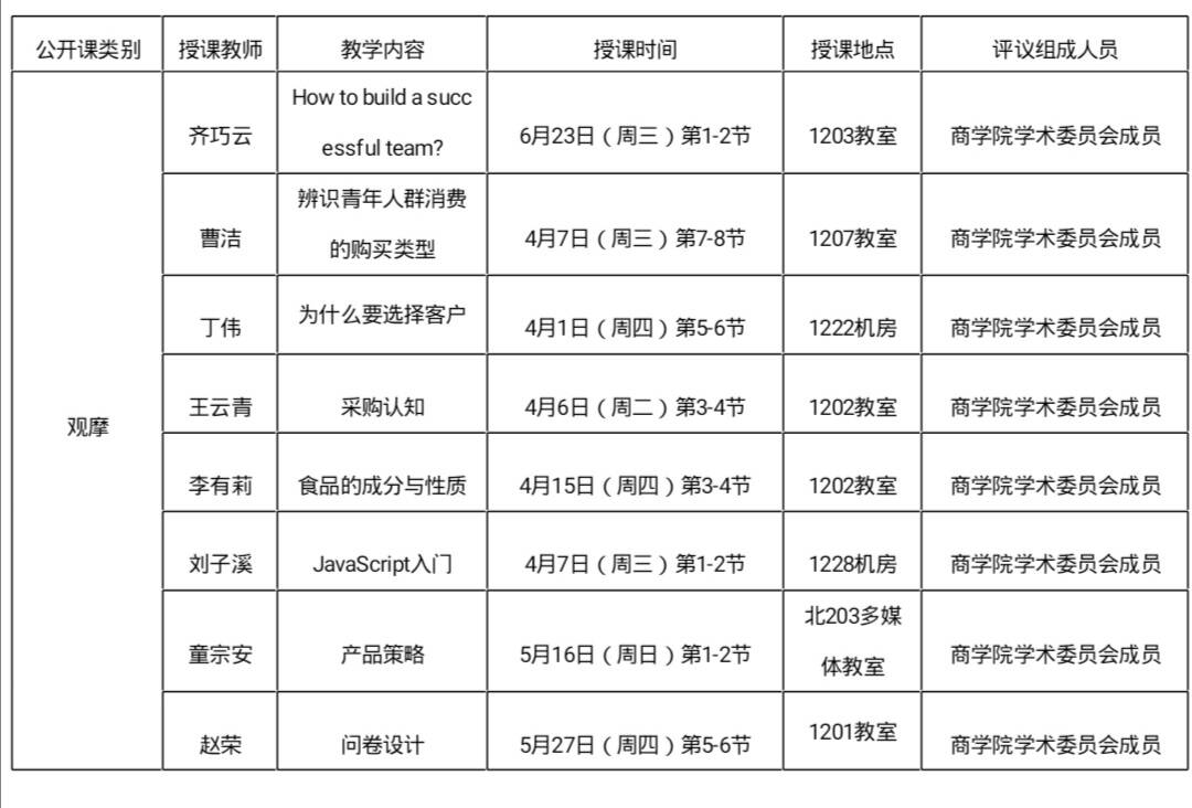 现将本学期商学院教师课堂公开课信息进行发布,具体安排如下表: