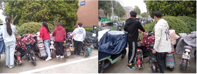 参与活动同学准时到达和平园宿舍楼外集合,并有序地分组开展活动,虽然天气不好,但是毫不影响同学们的热情,大家积极地参与到活动中,互相帮忙、齐心协力地所有电动自行车摆放整齐。在同学们共同的努力下,停车区恢复到整齐划一的模样。最后同学们一起举起院旗,留下具有意义的合影。