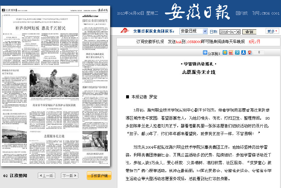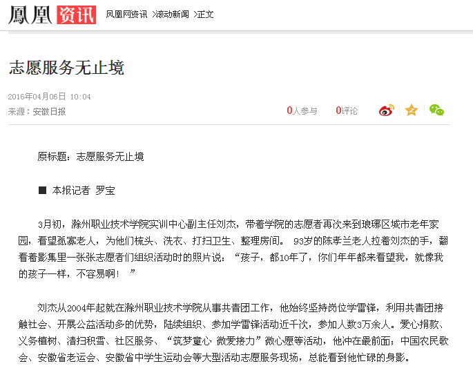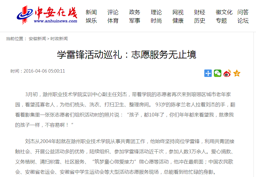 在省委宣传部、省文明办主办的第二批安徽省学雷锋活动示范点和岗位学雷锋标兵评选中,院实训中心副主任刘杰获“安徽省岗位学雷锋标兵”称号。此次获表彰的“安徽省岗位学雷锋标兵”共15人,滁州市仅1人。近日,安徽日报、凤凰网、中安在线、滁州电视台等多家媒体对刘杰的事迹进行了报道。