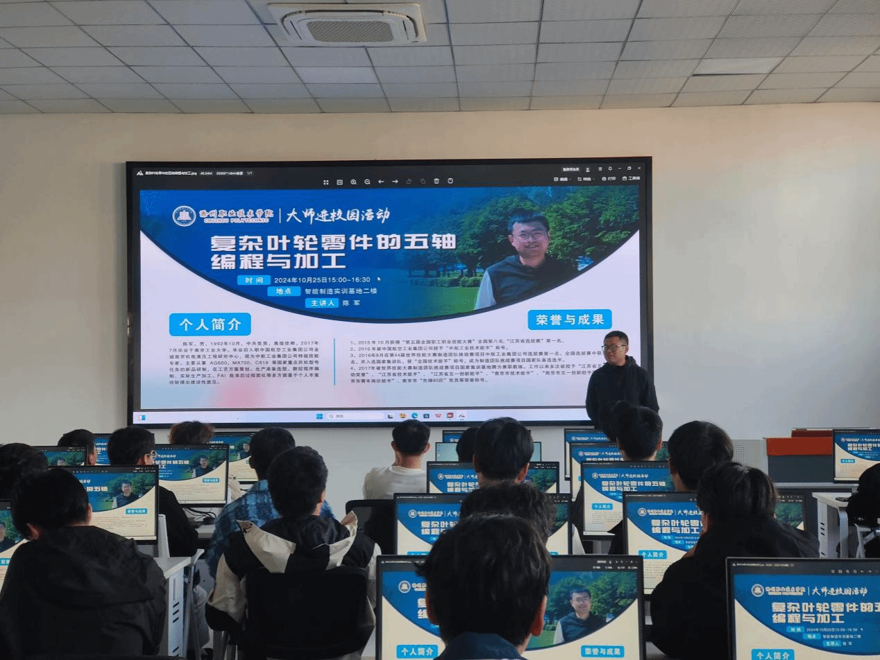 2024年10月25日下午,实验实训中心在智能制造实训基地二楼开展“复杂叶轮零件的五轴编程与加工”专题讲座。本次讲座特别邀请了全国技能能手、江苏省五一劳动奖章获得者、中国航空工业集团特级技能专家陈军来为365官网60余名师生带来五轴叶轮领域的最新前沿技术。