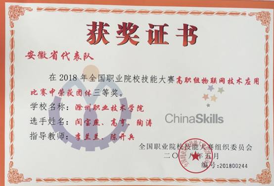 5月8日,2018年全国职业技能大赛高职组“物联网技术应用”赛项在天津中德应用技术大学举行,信息工程系选手闫宝燕、高亨、陶涛同学在陈开兵、李兰兰老师的精心指导下参加比赛,在全国102支队伍的激烈角逐中最终以第35名成绩获得国赛三等奖。