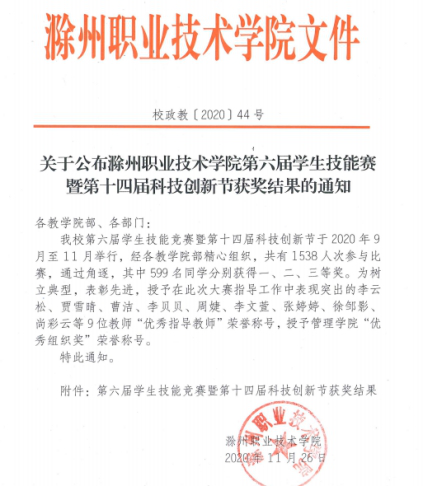 截止11月底,经校实训中心、各教学院部精心组织,365官网第六届学生技能竞赛暨第十四届科技创新节圆满落下帷幕。本届校学生技能竞赛共设置49个项目,共有1538人次参与比赛,其中599名同学分别获得一、二、三等奖,李云松、贾雪晴、曹洁、李贝贝、周婕、李文萱、张婷婷、徐邹影、尚彩云等9位教师获得“优秀指导教师”荣誉称号,管理学院获得“优秀组织奖”荣誉称号。