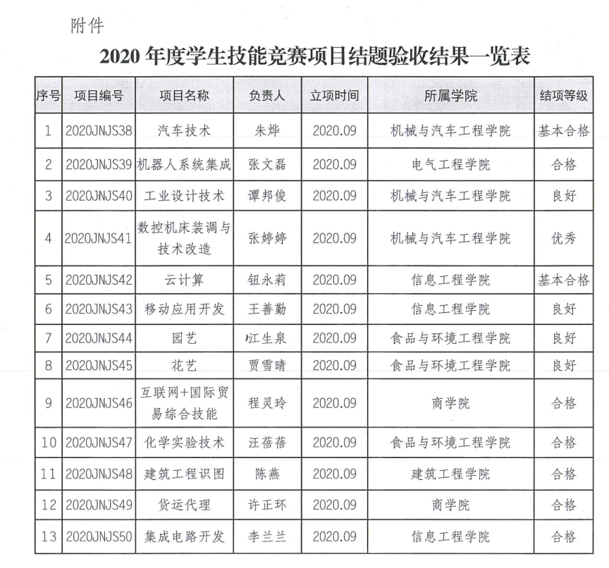 按照《beat365中国唯一官方网站学生技能竞赛管理办法》文件要求,学校于11月份认真组织了建设期满的2020年学生技能竞 赛项目结题验收工作。经专家评审、教学工作委员会审议、网站公示及校长办公会议审议等程序,2020年学生技能竞赛项目结题13项,现将结题验收结果(见附件)予以公布。