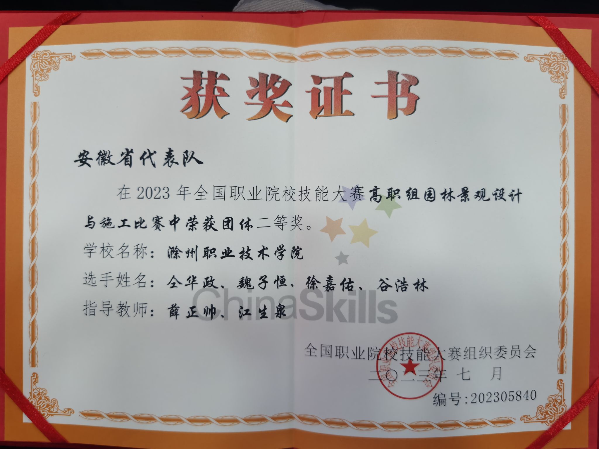 7月23日至26日,2023年全国职业院校技能大赛高职组“园林景观设计与施工”赛项在上海农林职业技术学院举行。经过激烈角逐,365官网学生徐嘉佑、魏子恒、谷浩林、仝华政组建的参赛队伍代表安徽省参赛。在副校长苏有良、食品与环境工程学院院长梁建军带领下,教师薛正帅和江生泉的指导下沉着应战,努力拼搏,以优异成绩荣获本次比赛二等奖。