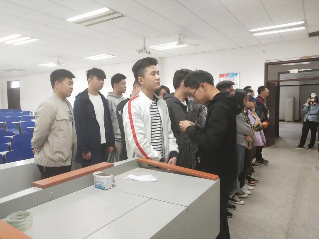 仪式开始,由老团员代表为新团员佩戴上中国共青团团员的象征,中国共青团团徽。随后全体团员在团旗下,高唱团歌。最后在老团员邱奥运的带领下,全体团员在团旗下进行了入团宣誓。