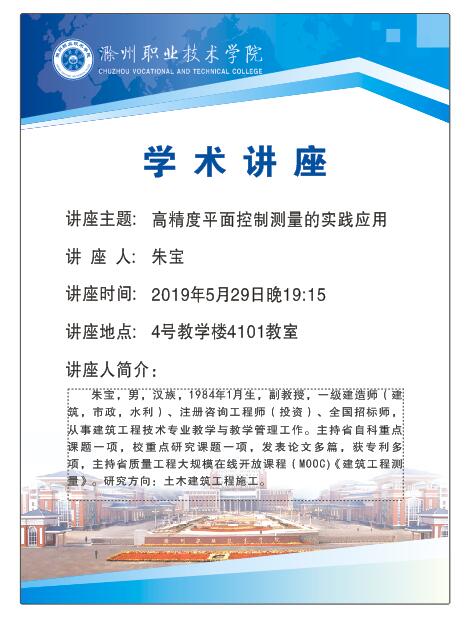 5月29日晚19时15分,土木工程系朱宝副教授在致学楼4101教室,举办了题为“高精度平面控制测量的实践应用”的讲座,土木工程系相关专业百余名学生及部分专业课教师听取了讲座。