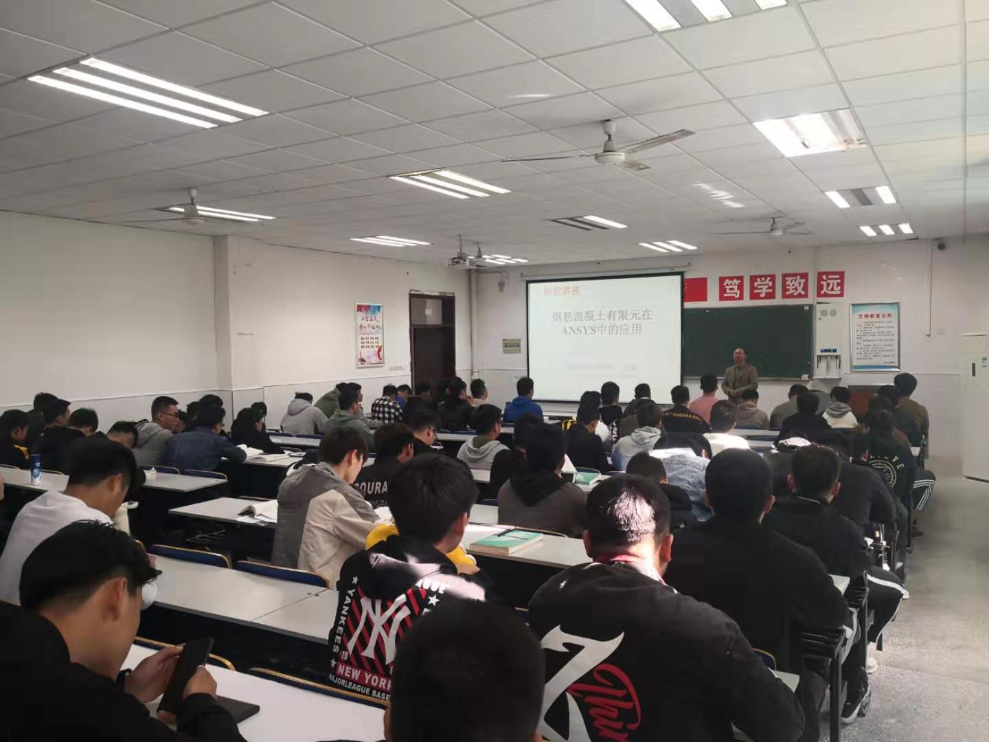 11月15日(星期五)下午19:00—21:00,由beat365中国唯一官方网站致研建材社团主办的题为《钢筋混凝土有限元在ANSYS中的应用》的学术报告会在教学楼4119室举行,建筑工程学院尤超副教授在会上做了精彩报告。建筑工程学院百余名学生听取了报告。