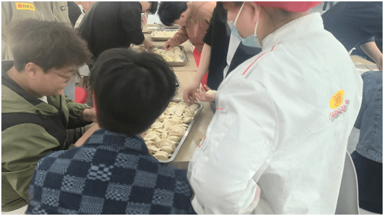 活动中同学们齐聚食堂,分工协作,切菜、和馅、擀饺皮,动作姻熟,有条不紊。经过两个多小时的共同努力,包出了一排排白白胖胖的饺子,经过后续的加工,一碗碗热气腾腾的饺子出锅了,同学们吃着自己包的饺子,脸上都洋溢着满足的笑容。学校食堂解经理非常支持同学们的这次活动,提供了许多帮助。学生们也端上自己做的饺子和解经理与食堂阿姨分享成果。