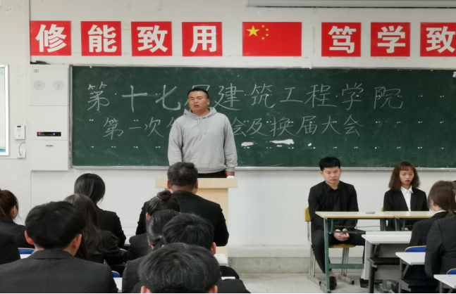2020年11月11日星期三中午12.30第十七届建筑工程学院学生会换届大会在土木楼4110正式召开。本次会议由建筑工程学院学生会组织,参加本次会议的有2018级学生会各部门和主席团、2019级学生会各部门和主席团和2020级全体学生会。
