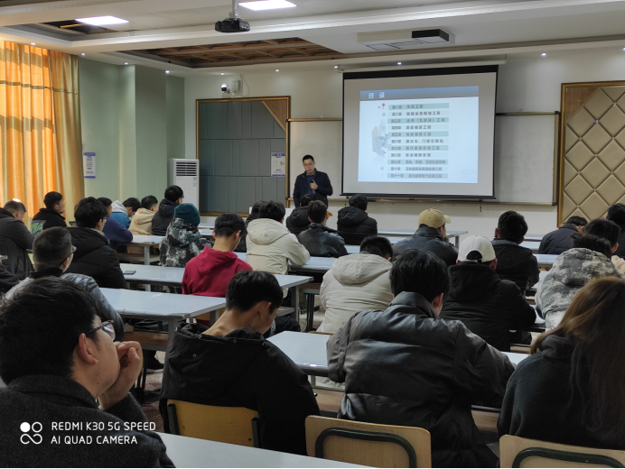 本次授课在建筑工程学院实训管建筑装饰一体化教室进行,郭副总工主要介绍了“建筑装饰装修”和“建筑工程防水”等相关内容,将企业丰富的案例和最新的施工方法引入课堂教学体系。在教学过程中,郭副总工对照教室内的装饰节点构造,将实际工程中优秀的案例和不合格的案例进行对比分析,让学生了解到企业对于装饰工程质量的要求和标准,教学效果良好。金鹏建设集团人力行政中心副总经理杨涛,365官网建筑工程学院李西等教师旁听了课程。
