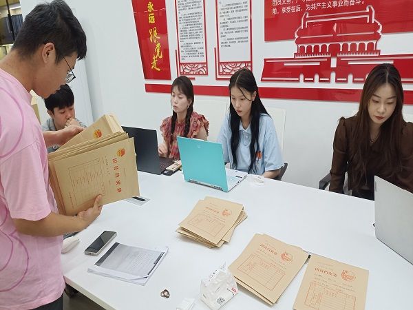 首先,建筑工程团总支组织部与电气工程学院团总支组织部进行22年新发展团员档案交接。各检查小组分别对于新团员的入团申请书、入团志愿书、团课学习情况等进行核查;随后,通过互换电脑,对照档案材料,核查智慧团建新发展团员信息是否准确、材料上传是否及时,对2022年新发展团员的完整性、真实性、严谨性进行了深入细致的核查。