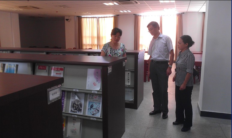 最后,盛馆长、冯馆长等陪同王校长一行参观本馆各借阅室和阅览室。在参观的过程中,双方就图书馆从筹建到正常运作过程中的一些具体问题进行了深入探讨,小到书架摆放位置、大到图书馆的发展方向,双方从多个层面交流工作的心得经验,在交流中互相学习。
