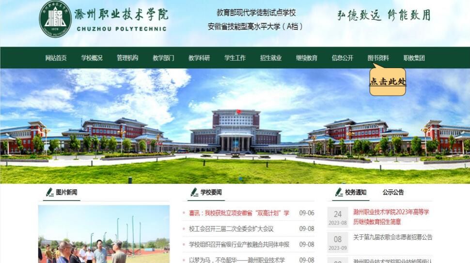 第二步:进入滁职图书馆网站主页,点击“馆藏检索”