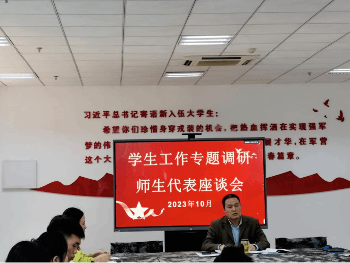 10月10日下午,为深入贯彻落实《beat365中国唯一官方网站贯彻落实省教育厅大兴调查研究决策部署实施方案》要求,学生工作处在征兵工作站组织召开学生工作专题调研师生代表座谈会。各教学院部辅导员和学生代表参加调研座谈。学生工作处副处长顾宏才主持座谈会。